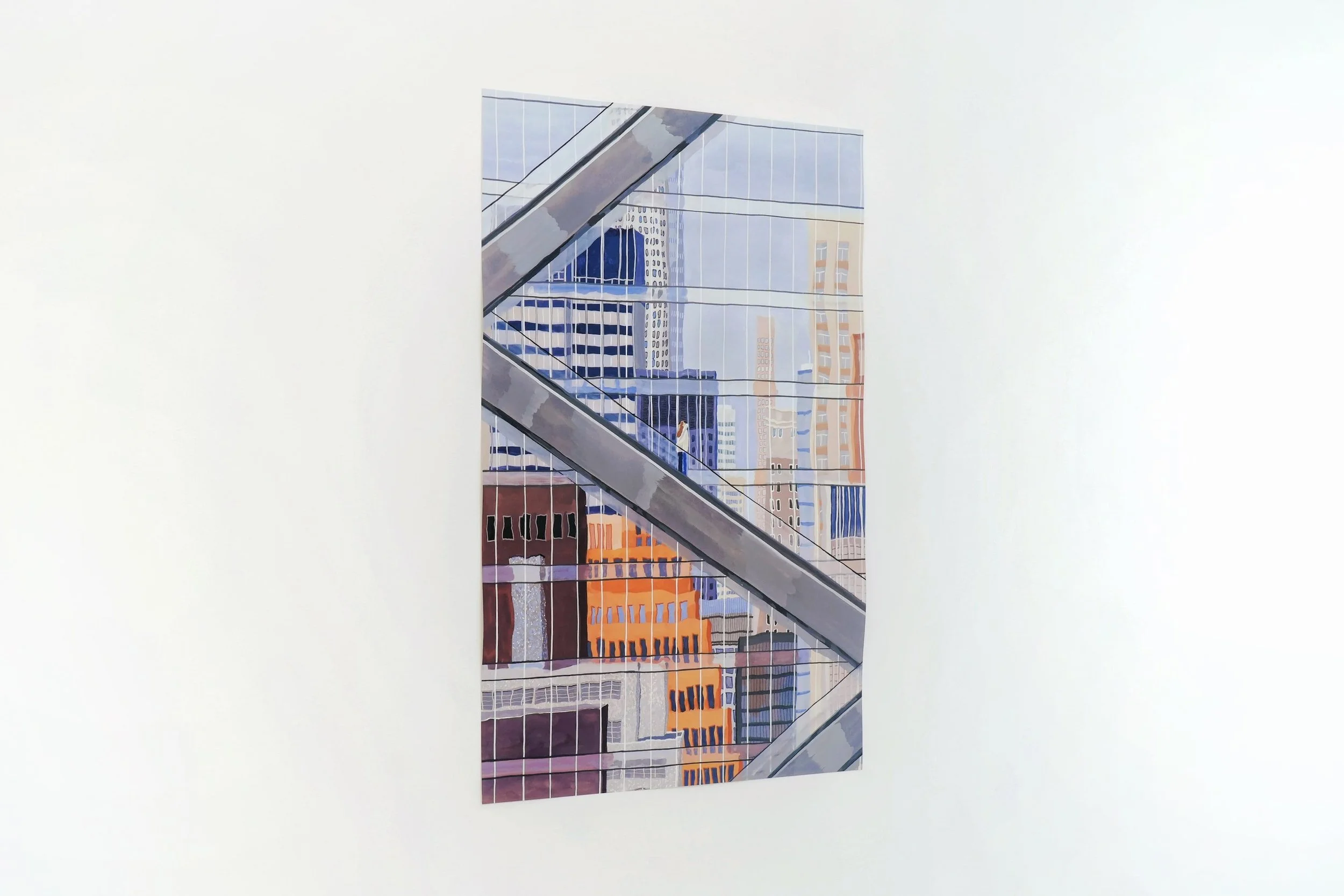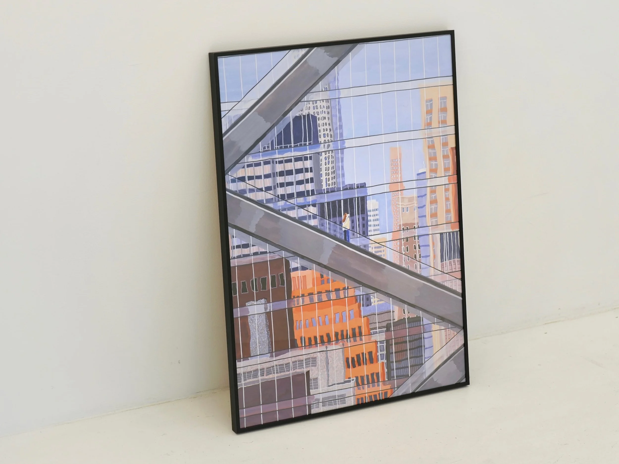 도심 속 풍경을 비추는 파사드에 기대어, 그리고 서로에게 기대어 포옹하는 두 인물을 그린 작품입니다. 이슬아의 작품집 <Things In City> 표지의 작품과 연결성을 찾아볼 수 있는 작품으로 도시에 대한 작업을 이어가는 이슬아 작가의 대표작 중 하나입니다.